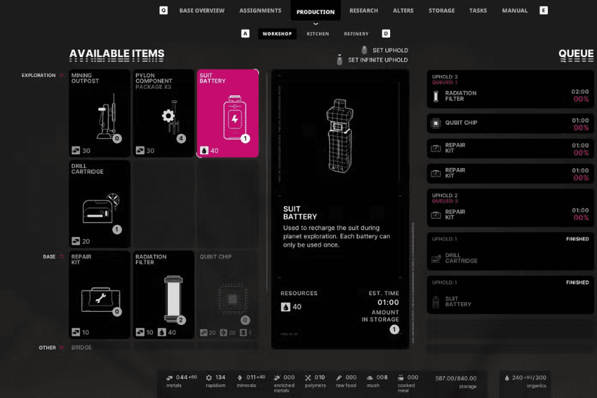 The Alters has an auto-crafting system to Uphold Production, where you can set a minimum number of items like food, radiation filters, or repair kits. When your inventory dips below that, the game automatically queues the production—as long as you have someone assigned to do the work.