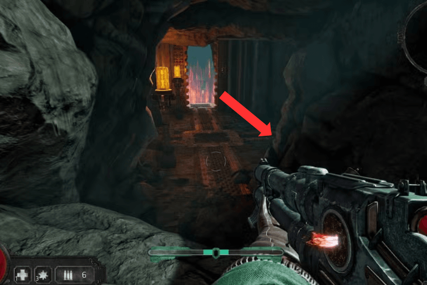 - Beyond this locked door, the path will take you eventually to the boss arena, which is easily identifiable since it’s a marked glowing red wall bar.