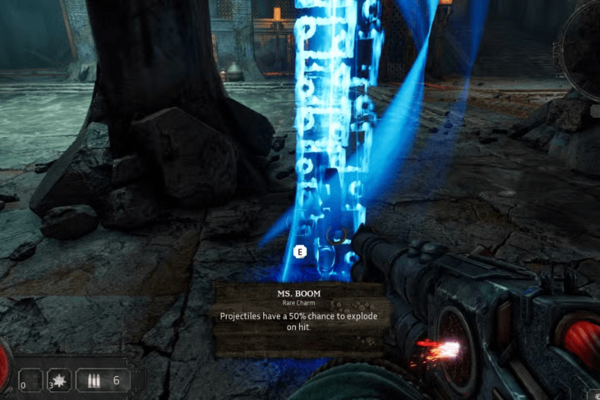 Unleashing the Hidden Brazier uncovers a Rare Charm called Ms. Boom. This is a very helpful charm that gives all of your projectiles a 50% chance to detonate on impact and create area damage.