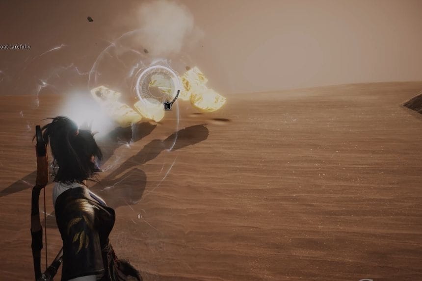 Once you’ve interacted with each of the three treasures, you’re done with what you needed to do to end this encounter when you wake back up. Next, you’ll need to interact with one of the NPCs nearby, and then you can follow the quest markers to finish this encounter. When you do so you will receive the Sunwood Spear as a reward for completing this interaction.