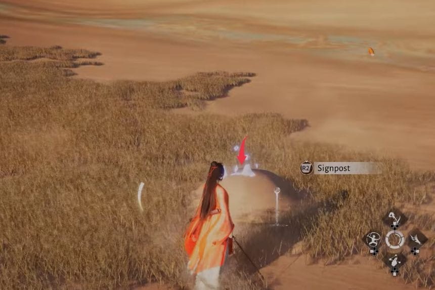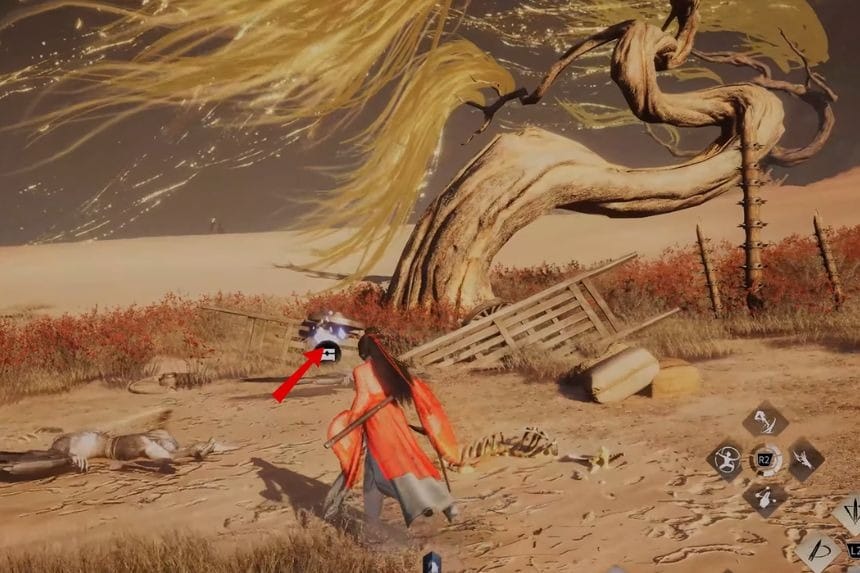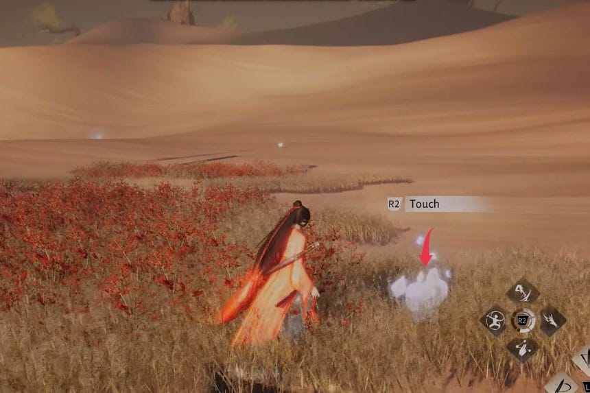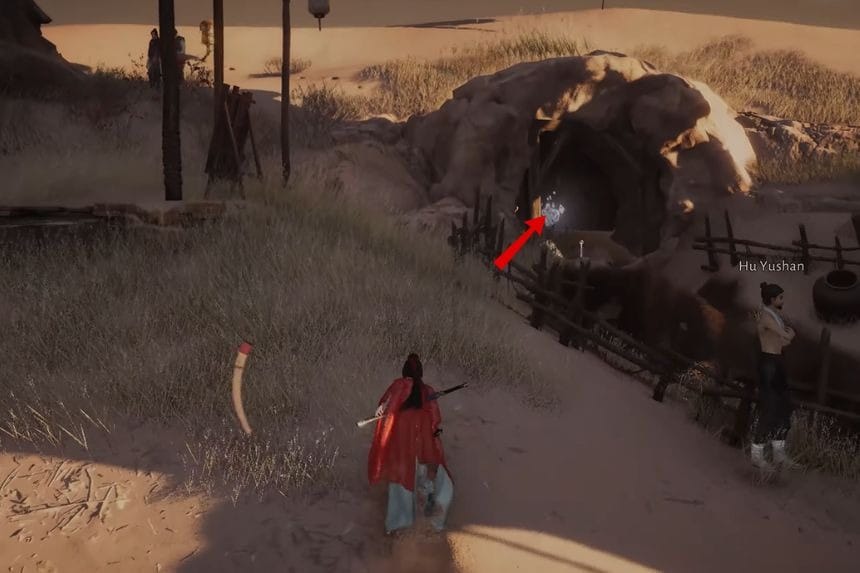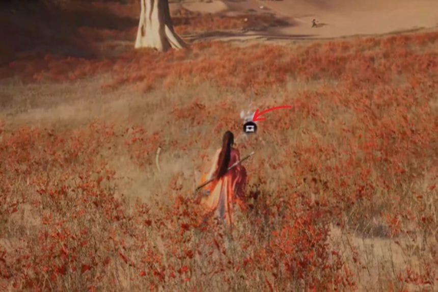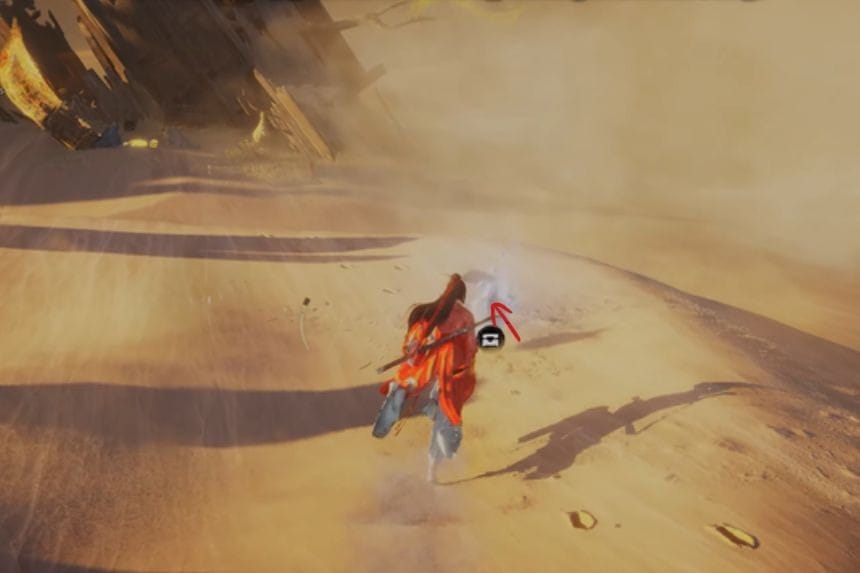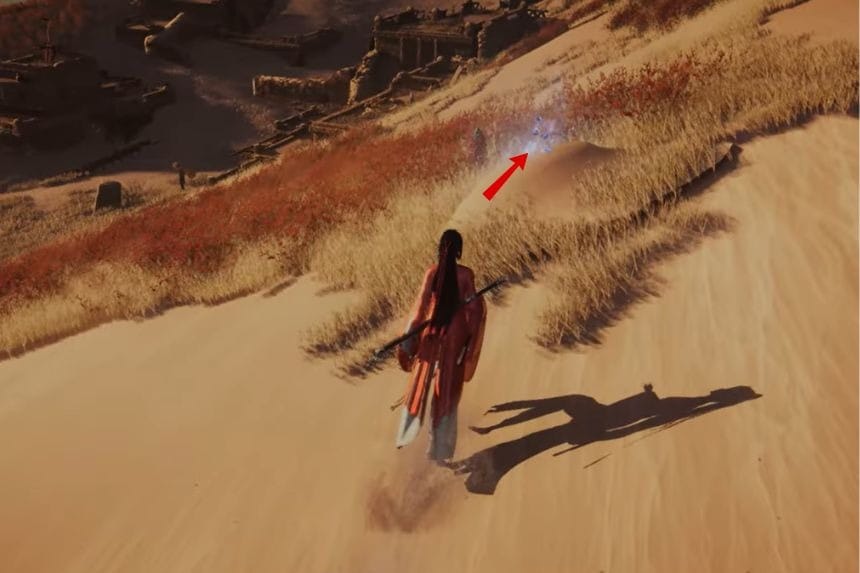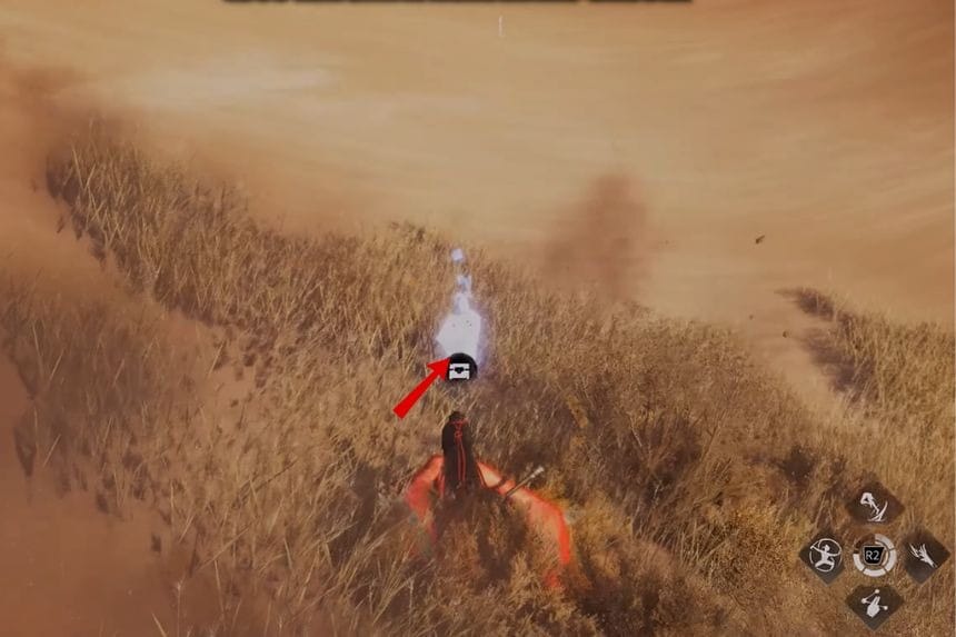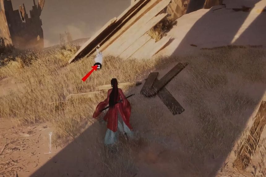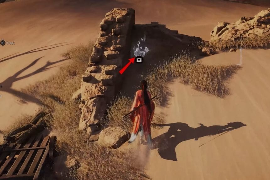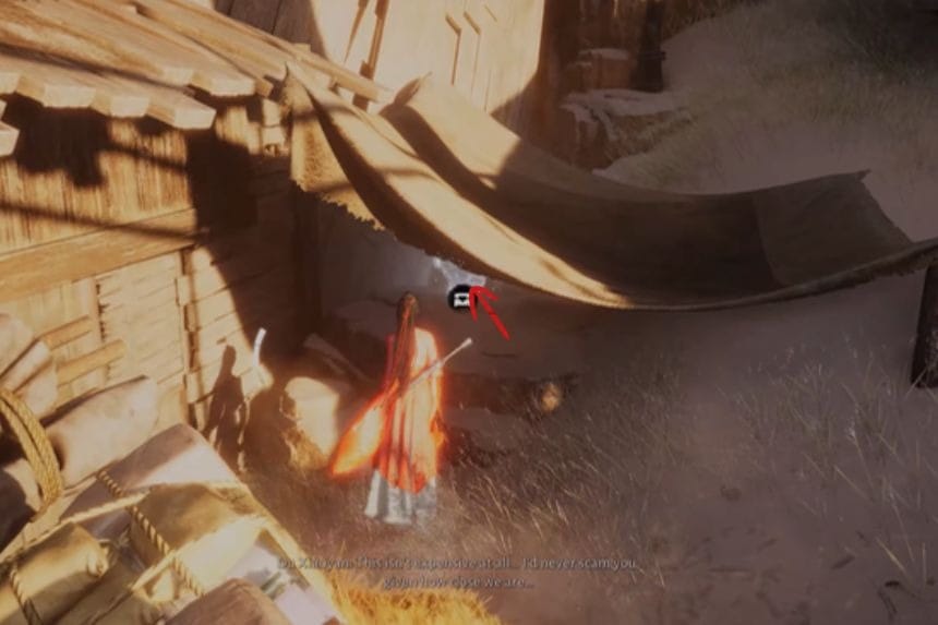 To get the fourth chest, you’ll need to go a little towards the middle of the map. Once there, you’ll see that there’s a small settlement in the middle of the desert. There’s some dry grass growing a little further away from the settlement; this is where you’ll find the chest.