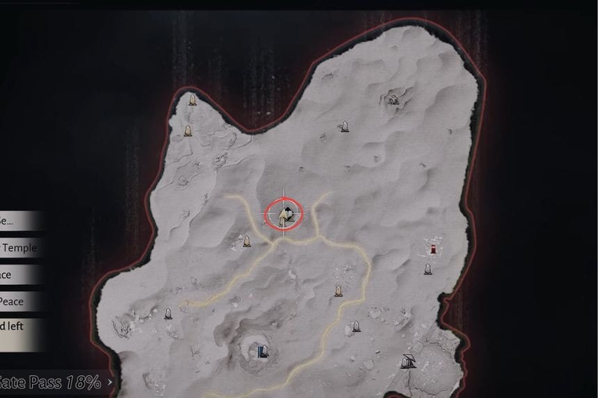 To get the last chest, go to the marked location, and you’ll find a few villagers near a signpost looking at the bell in the distance. Interact with the bell, and it’ll lead you to the skeleton, where you’ll find the chest.