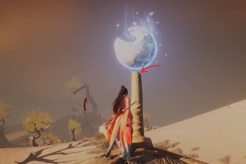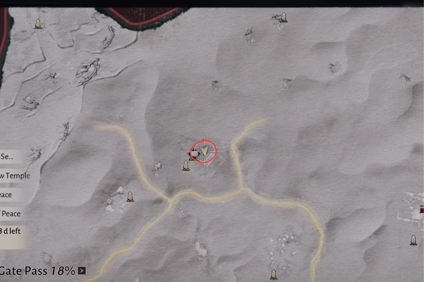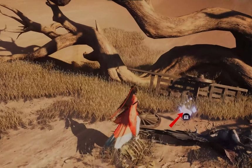 Head over to the location marked above, and you’ll find yourself in the desert. There are no specific landmarks around, apart from some trees on the northwestern side. The chest can simply be found lying in the desert in plain sight.