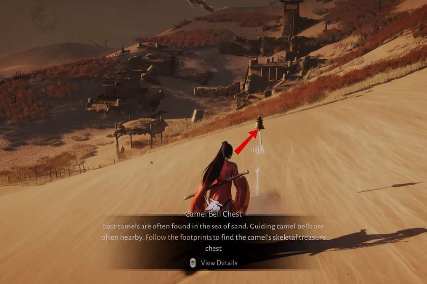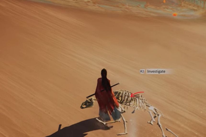 To get the 21st chest, head over to the marked location, and you’ll find a Camel Bell Chest floating in the air in the middle of the desert. Interacting with it will reveal a signpost that helps you track an animal’s skeleton in the desert. Investigate the skeleton, and you’ll get the chest.