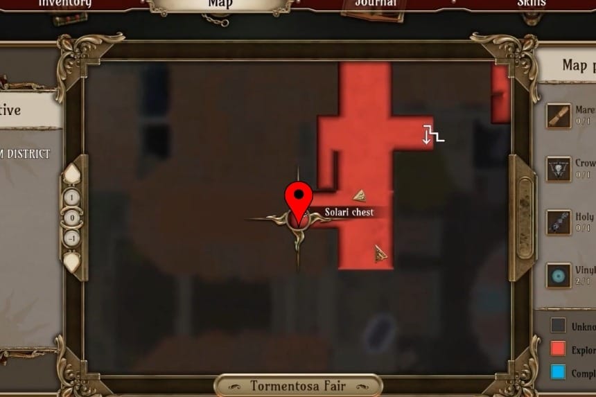 To get the Solari Chest 2, you’ll need to head to the Tormentosa Fair in the Ram District. Go to the marked location, and you’ll find the Solari Chest near the foot of the stairs, toward the right. Use the Solari brooch to open the chest and get the Crow Relic 7 and 250× silver bulls.