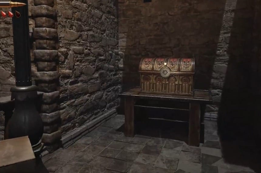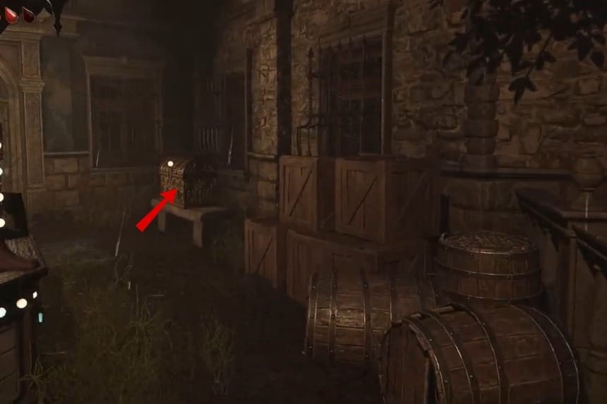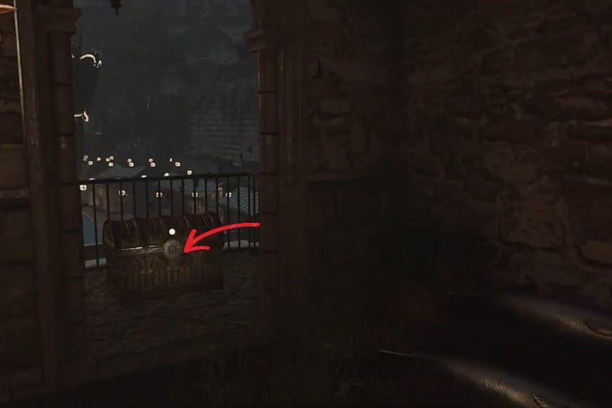 To get the Solari Chest 5, head over to the marked location, where you get the Fair tickets. To its right, you’ll find some crates and barrels, and amidst that, there’s a bench that has the Solari Chest 5 resting on top of it. Use the Solari brooch to open the chest and get the Crow Relic 10, along with 250× silver bulls.