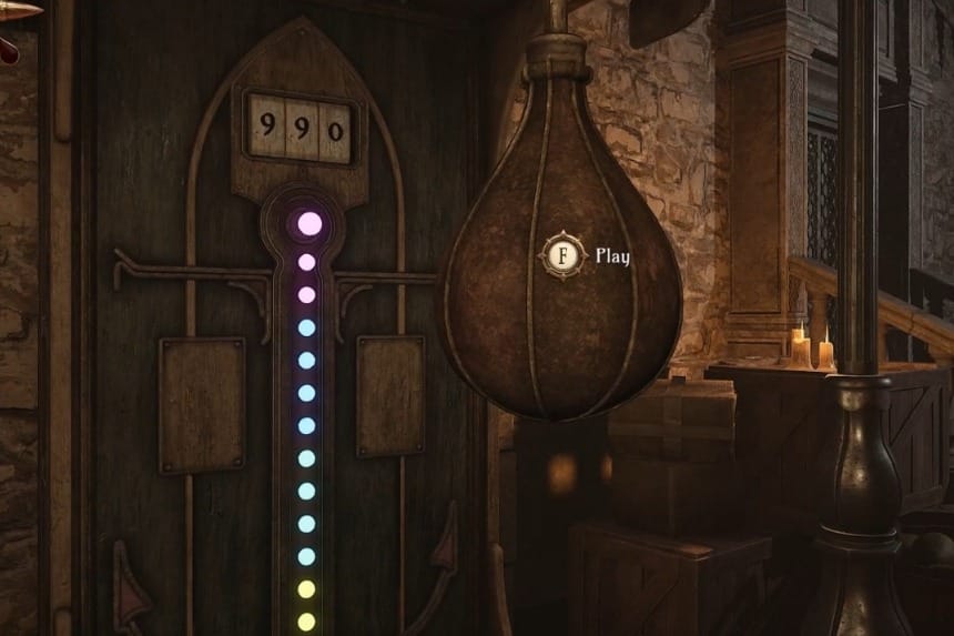To play the second carnival game, head over to the marked location, and you’ll find a punching bag game setup in front of you. Your objective for this one is easy: hit the bag as hard as you can and get a score of 990 to win the game and get 300× Fair tickets as a reward.