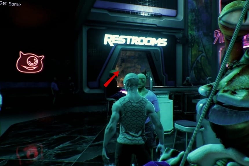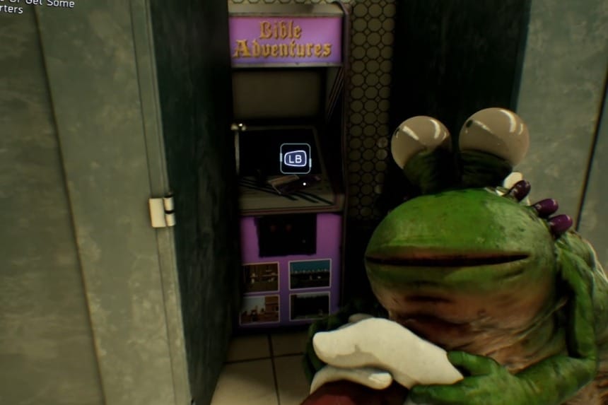 To get the second one, which is Bible Adventures, you’ll need to go to the Liquid Nights club on the Pinkline Harbor map. You’ll need to have Bowie unlocked to get through the entrance, then talk to the bouncer to enter the club. Go toward the restroom in the back, and you’ll find a rather vague hall at one side of the stall. Interact to open the door and search the stalls to find an arcade machine from which you can pick up the cartridge.