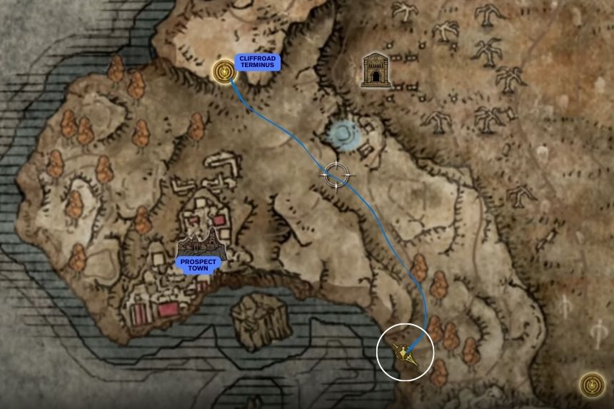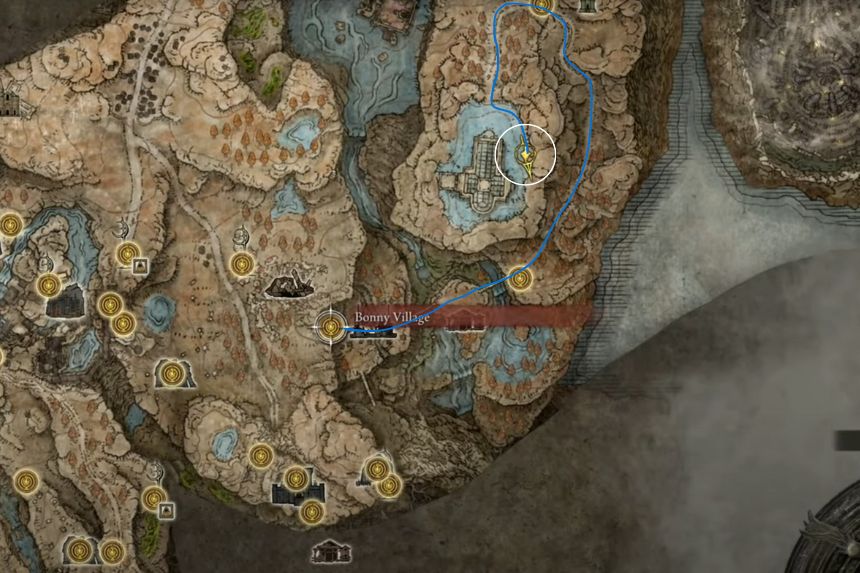 To find the Greater Potentate’s Cookbook [4], you need to spawn at Bonny Village or any of the nearest Site of Grace you may have unlocked. Once, you spawn at the Bonny Village, follow the path highlighted in the above map to Cathedral of Manus Metyr. Go to the location marked on the map and loot the corpse. It unlocks the Hefty Magic Pot.