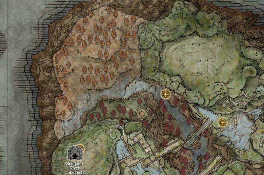 To find the Greater Potentate’s Cookbook [8], spawn at the Scorpion River Catacombs site of grace and go North to the location marked on the map. Loot the corpse and you will get the 8th cookbook. It unlocks the Hefty Fetid Pot.