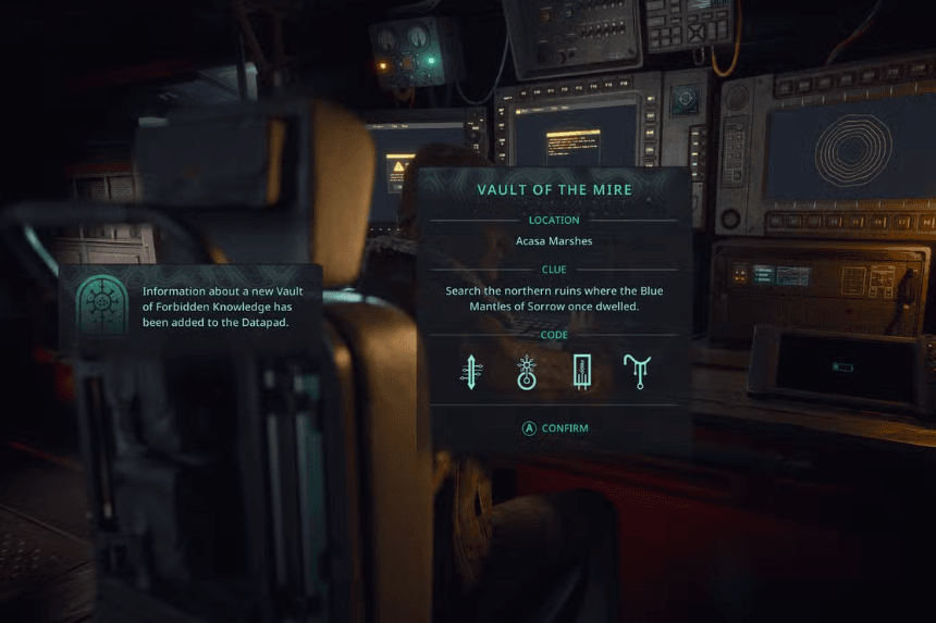 Another vault is concealed in Vyssa Hills, behind a waterfall that appears early in the region. The tricky part is reaching it; you’ll need to approach from above and carefully descend into the cavern behind the cascade. Once inside, the code to open the door is Admiration, Amazement, Ecstasy, Rage.