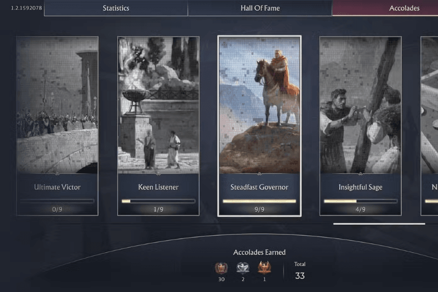 At any time, you can check your progress by clicking on your governor’s portrait at the top of the screen. Below is the full breakdown of how much Fame each Accolade offers.