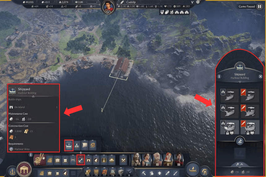 Before you can craft your first vessel, you’ll need a Shipyard, located in the Harbour Buildings menu. This doesn’t unlock immediately. You’ll need either: