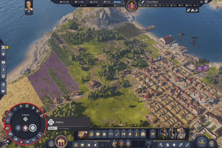 Once it’s unlocked, you can switch regions at any time by clicking the earth icon in the circular menu at the bottom left. You can also use World View to see the distance between Albion and Latium and track where your ships are during long-distance routes.