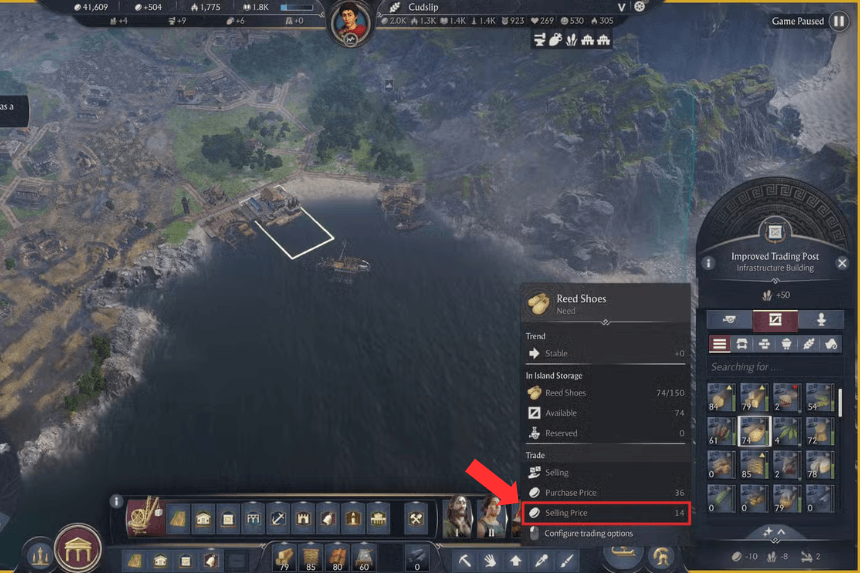 Trade routes aren’t just used to move supplies between your islands. You can also use them to sell goods to NPC cities that pay a premium. For example, Manx’s Harbour will always buy Reed Shoes for 21 Gold, a large amount more than its normal selling price of 14. If you plan on farming money through this method, setting up a dedicated trade route is well worth it.