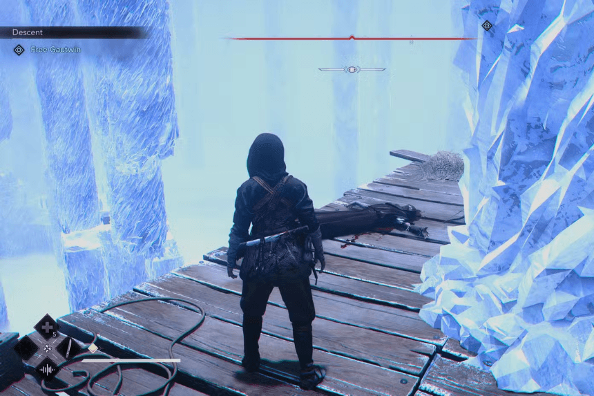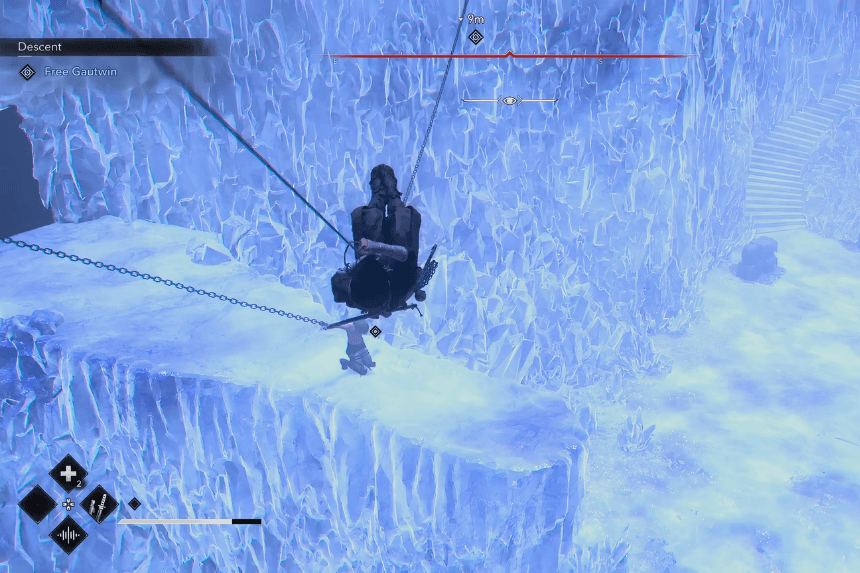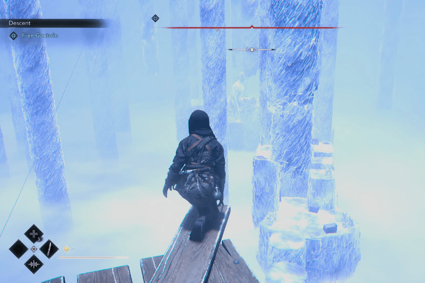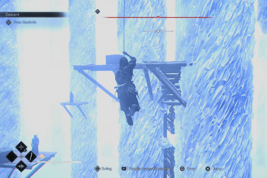 Climb back up toward Gautwin. Once you’re at the old wooden platform, get ready for the final fight. A double grapple swing lands you on Gautwin’s platform—be careful not to overshoot.