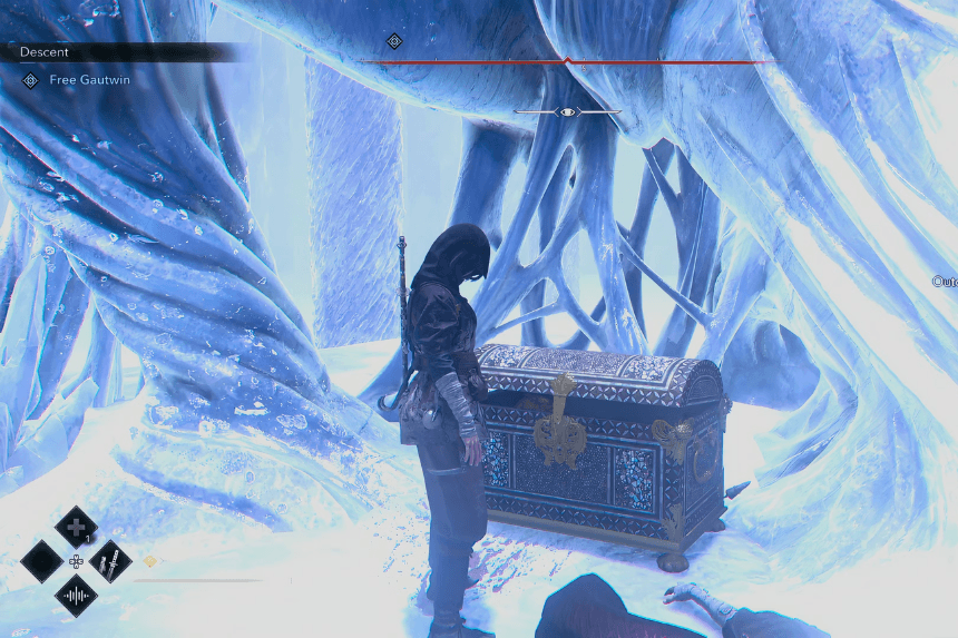 Continue until you reach a small cliff with a chest tucked below it; climb down the crystals to grab the Garrison Banner.