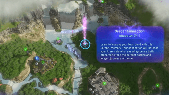 From the Laser Ore Processor Alpha, head north along the Bough River. You will stumble across the tree that holds the Tarsyu Flower. Interact with the flower to unlock the Deeper Connection Ancestor Skill, which gives your Ikran a 50% increase in stamina.