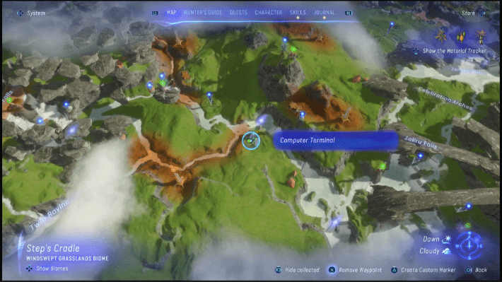 To start the third part of the Finding Home questline, make your way to Step’s Cradle in Upper Plain. You can find Step’s Cradle north of Stoneblade Ridge, west of Celebration Valley, and east of Eywa’s Reach. You have to find the Windswept Grasslands biome here and make your way between Zakru Falls and Twin Ravine. On the river bank you will find the computer terminal that you can hack using the SID.