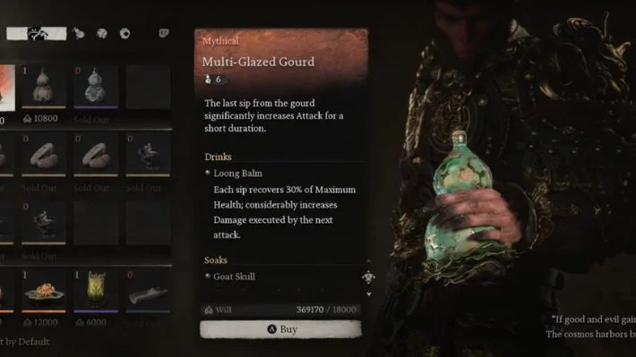 This gourd is obtained very late in the game, and serves an important purpose. After consuming the Multi-Glazed Gourd, you are granted a significant increase in attack for a short duration. There is no catch to gaining additional attack stats this time around, so you can safely consume the contents of the Multi Glazed Gourd till the last sip to gain a boost in your attack stats. You can get the Multi Glazed Gourd from Shen Monkey after you reach Chapter 6