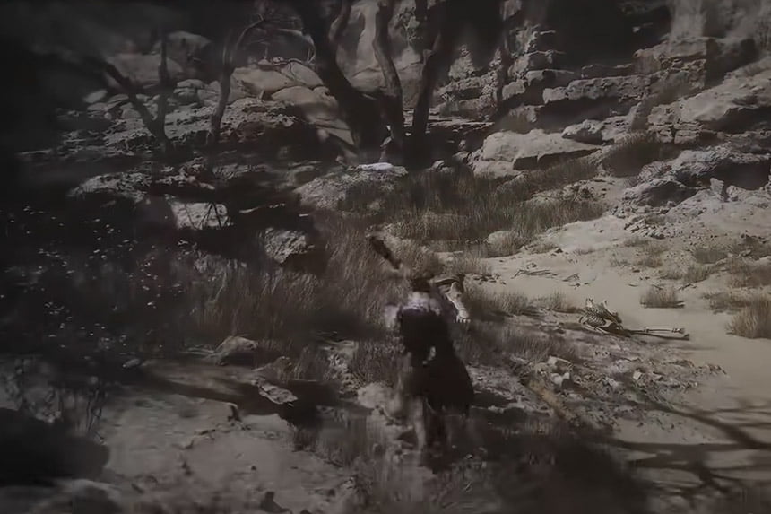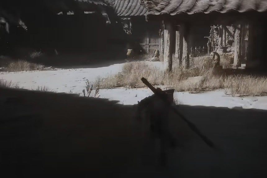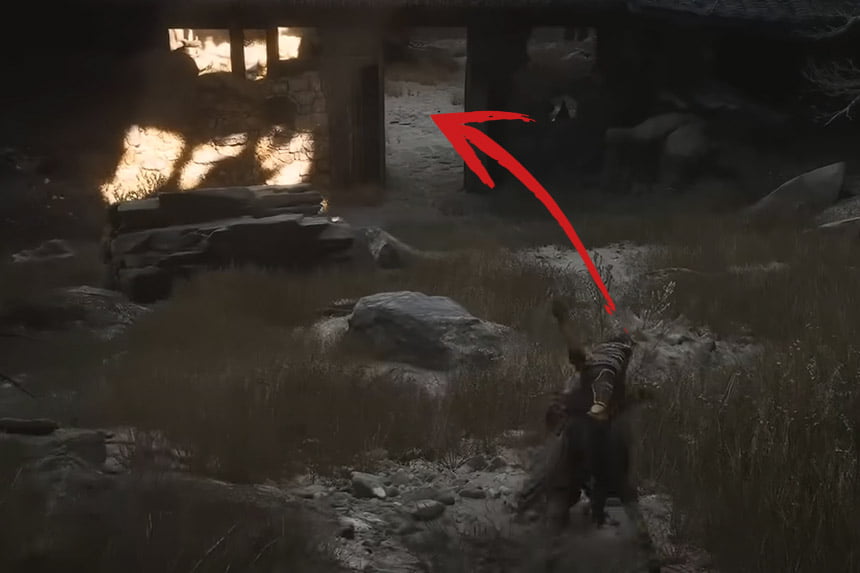 Go straight until you reach the other end of the village as shown in the above image. As soon as you reach the exit and get out of the village complex, everything will go gray. Go a little forward and the “Use” interact sign will appear, interact with it and a small boy will appear. There will be a cutscene and the boy will jump inside the well asking to follow him.