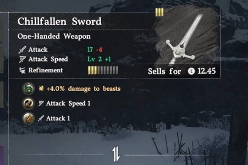 The Chillfallen Sword comes with Abyss Gear that deals 4% extra damage to beasts, making it especially useful when hunting legendary beasts. The weapon’s attack speed is Lv 2, though it may not outperform mid- to late-game weapons.