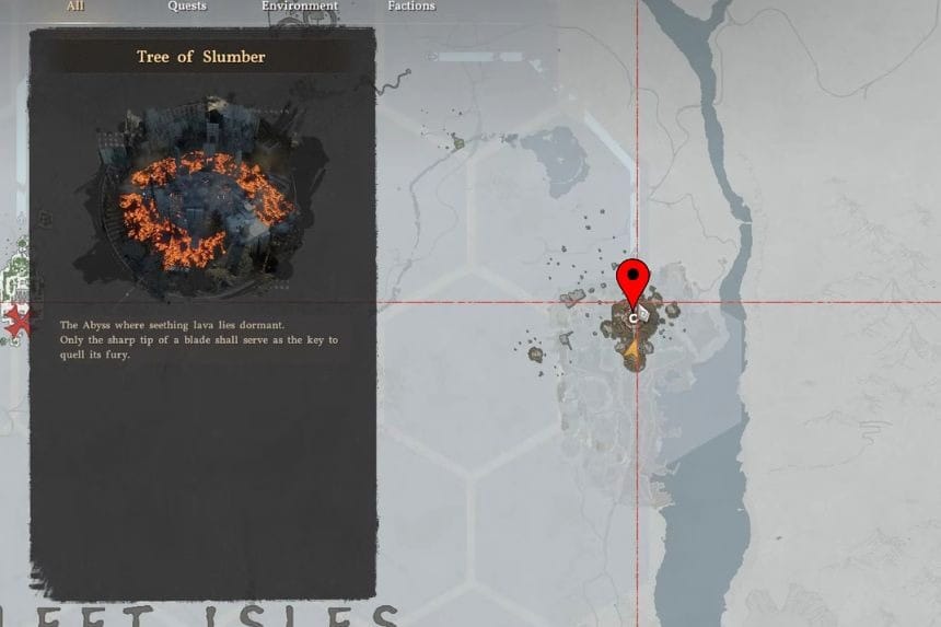 You can find the Tree of Slumber puzzle in the Sleet Isles after completing the Loop of Life puzzle. After unlocking the fast travel point nearby, go inside the main puzzle chamber and you will find many pillars rising above the lava.