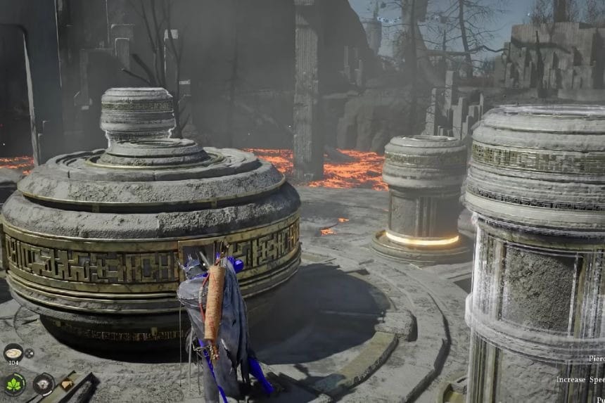 Next, climb onto the nearest pillar and crouch once you’re standing on it. From this position, use Force Palm downwards. As you’re doing this, the pillar you’re standing on will move downwards. When the pillar reaches the correct position, the puzzle will be activated. All the pillars will turn blue, and the button you need to press will be in line on the opposite side of the room.