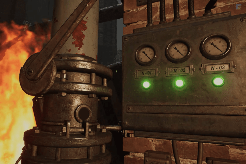 Only when each one turns on the right way does the burned-out passage open up, letting you reach the foreman.