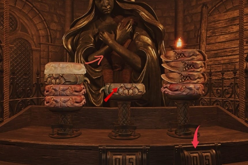 For the first puzzle, head to the marked location, and you’ll come across a small setup with three stands having multiple circular rings on them. Here, you’ll need to balance the weight between the first and third stands by distributing the circular rings in a balanced way and making sure the numbers reflecting below the setup change to 4. Once that’s done, you’ll see a statue has emerged and gone up from behind the setup, completing the first puzzle.