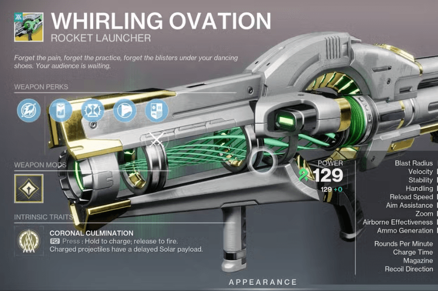 One of the highlight Exotics released with The Edge of Fate expansion in Destiny 2, Whirling Ovation is an interesting Rocket Launcher that’s making a quick splash. Its capacity to put together both Solar and Strand elements in one overcharged volley makes it a desirable item for any Guardian’s arsenal—particularly those who prioritize synergy and crowd control.