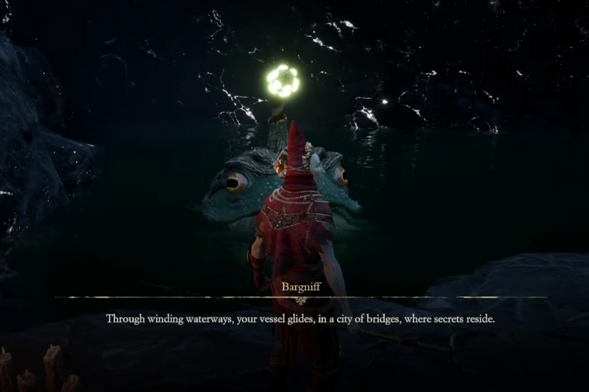 After you put on the Gondolier’s Mask and talk to Bargniff again, he’ll tell you to ‘proceed.’ At first, it might be confusing, but you can now interact with a boat near him. This boat will take you to a secret place. This is how you can get to the very bottom of the mines and meet Litho, one of the gods.