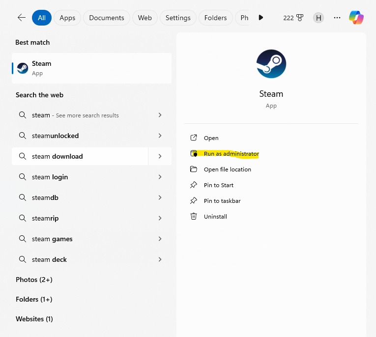 3. Reboot the PC and Run Steam with Admin Permission