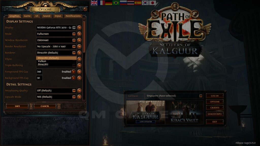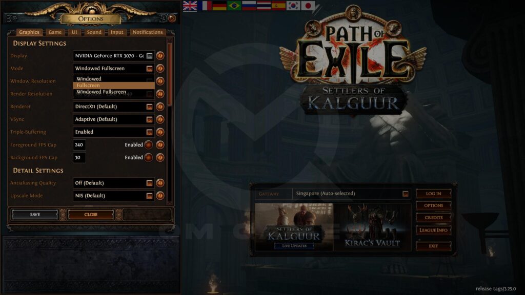 Another fix that’s worked to bypass the Path of Exile 3.25 Crashing at Oil Fields and Oak Fight bug is to play the game in Fullscreen. For some reason when you play the game in Fullscreen, the game does not crash. To enable Fullscreen, click on the Options from the start screen to go into the Options Menu.