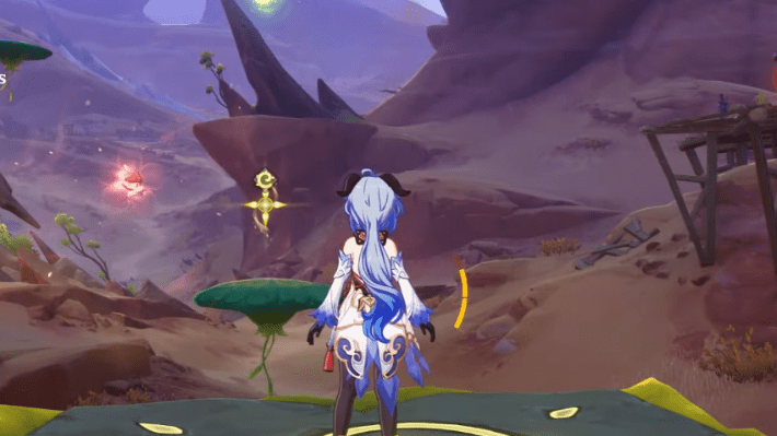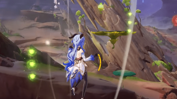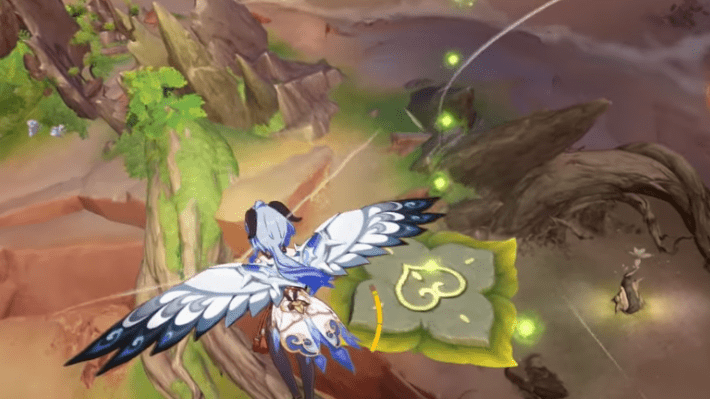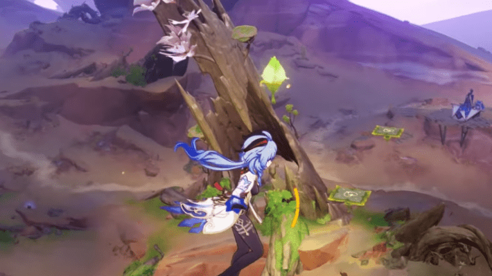 Set the in-game time to the next day, then glide towards Jarjar’s location. For the third trial, you need to collect 27 Dendro particles. Swing once then glide down to the platform, then make a bridge to get up. Swing towards the mushroom, then bouncing up to collect the other particles.