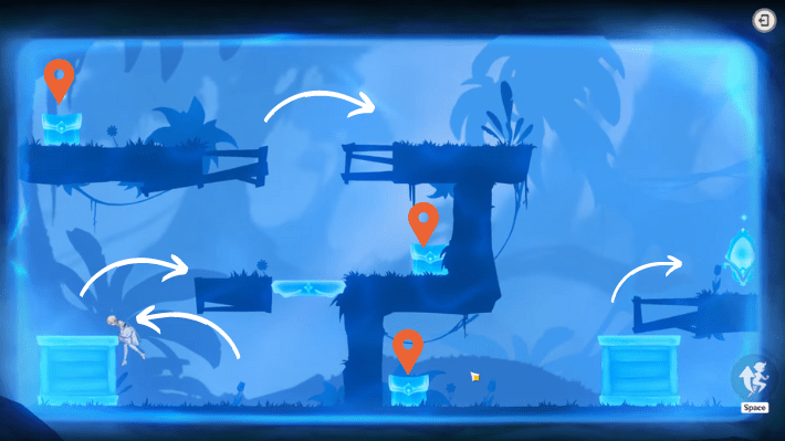 Once that is done, use the projector to see the preprint. The mini game is quite simple. You need to step on the crate on the left first, then jump up to the middle platform. Unlock the chest at the end, then hop on to the movable platform in the middle. Get up, then go left, then find the chest there. After that, jump across and drop down to the far right side. Go all the way down first, unlock the chest to get the component, then use the crate to climb up to the exit portal.