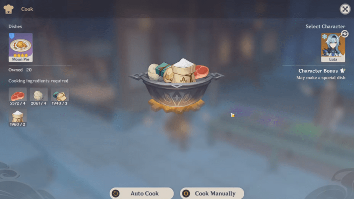 After acquiring all the above ingredients, head over to any cooking station to create Moon Pie. But to make Stormcrest Pie, you need to cook Moon Pie using Eula. There is a random chance that while creating Moon Pie, you can get Stormcrest Pie as well. You can then give it to any character and reap the benefits.