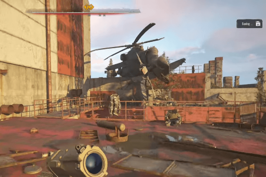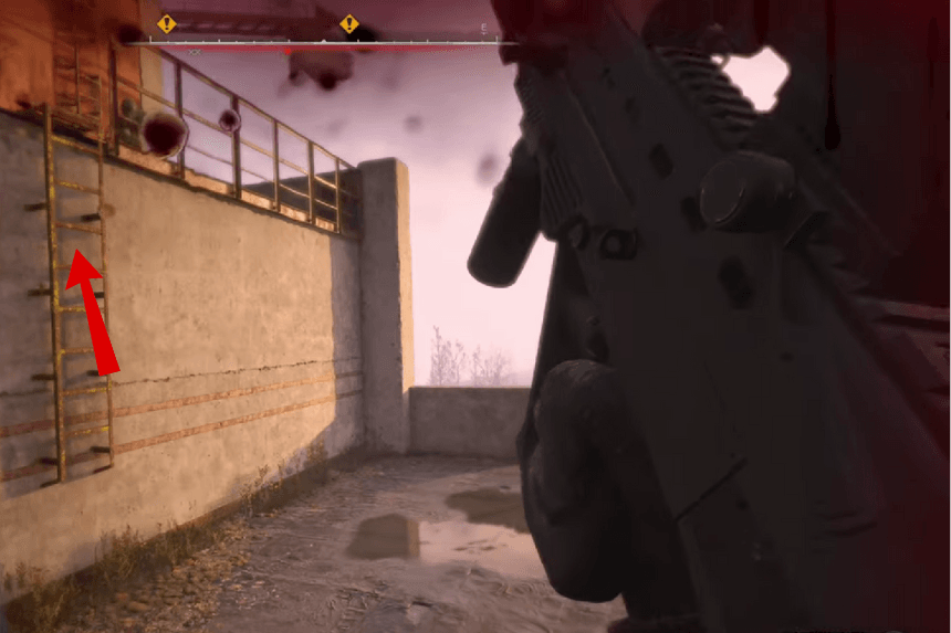 Go up the ramp and turn around. Climb the ladder on the other side to reach the rooftops. Fight off the enemies as you head northeast towards another ladder. Defeat the enemies at the top and climb the stairs. Don’t climb the next set of stairs, instead, turn right and go towards the crashed helicopter. Climb the ladder near the helicopter. Once you reach the top of the Red Fortress, you’ll encounter Strelok. You can talk to him about the death of Kaimanov and after a cutscence he will open a portal to let you both in.