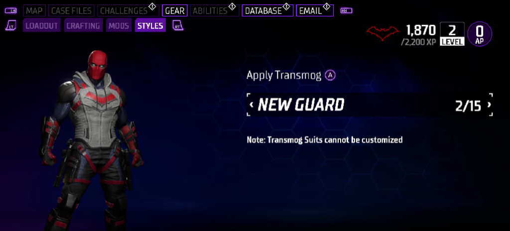 Changing your character’s appearance is easy to do in the Gear tab by going over to the computer, workbench or opening up the in-game menu using the BatComputer. Your current character’s gear tab includes your loadout, crafting options, mods, and style options.
