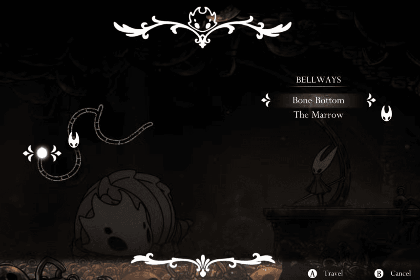 Spaced intermittently throughout Pharloom, Bellway points allow Hornet to ride upon a massive creature known as the Bell Beast. Bellway points can be found by signposts containing three right-pointing chevrons. With them opened, the Bell Beast can take Hornet instantly between any previously reached point. There are a total of ten Bellway points on the map and they function similarly to the network of the Last Stag’s from the original game.