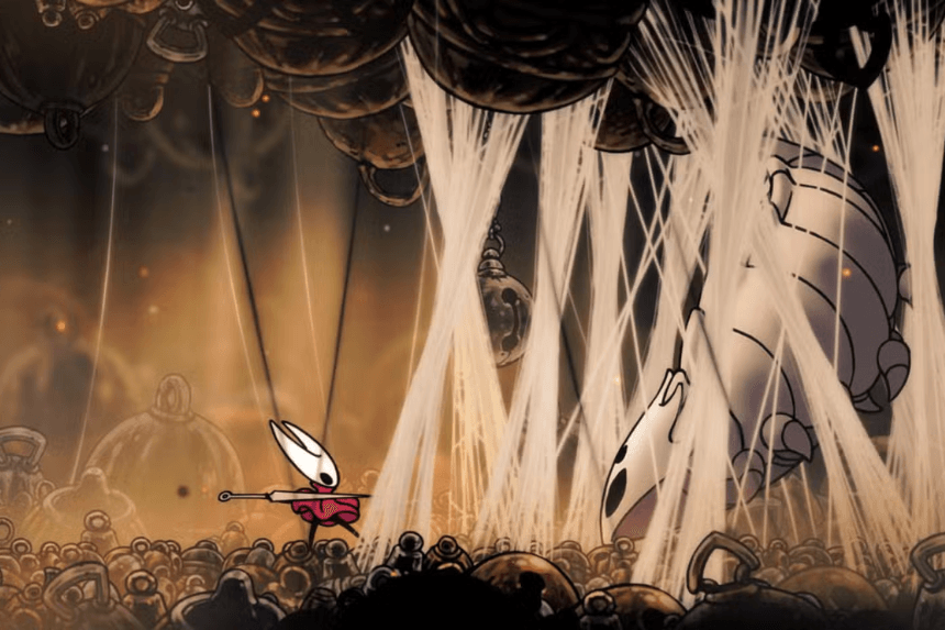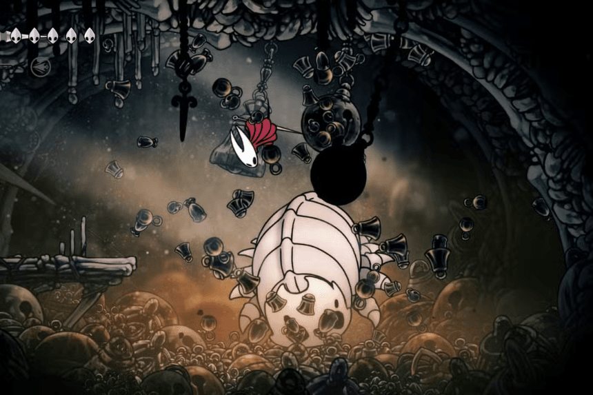 The battle against the Bell Beast is all about timing and agility. The beast attacks by charging around the arena, dropping bells onto the arena from above, and jumping up into the air to stomp on Hornet. Victory lies in paying careful attention to these habits: avoiding falling bells, leaping over charges, and hitting safely once the beast touches down.