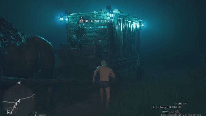 If you are planning on trailing behind the Oxcart instead, again make your way to the Oxcart location at night. Stand some distance away so you don’t alert the coachman. Stand at an Oxcart’s length away from the vehicle and wait for it to move. The monologue of the coachman should be negligible to read but not completely faded at the bottom of the screen. Strange music will start as well once the Oxcart is some distance away from you.