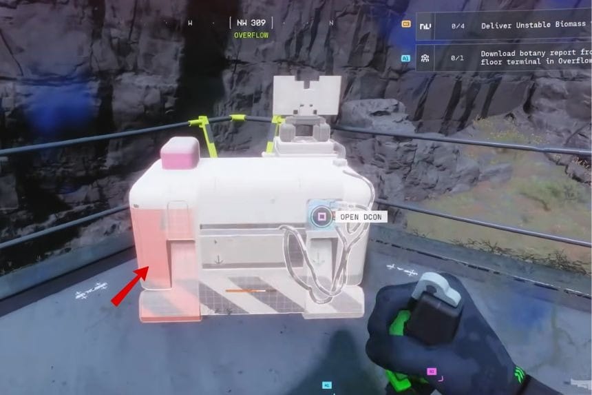 Look for a small box or crate that will be marked as the DCON station on your map and, after gathering the biomass needed, go to the DCON station and drag the items into the DCON to finish the challenge.