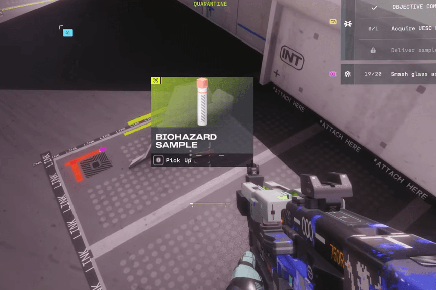 Once you’ve destroyed the equipment, pick up your biosample. You must then go to the nearest DCON (Extraction Point), which is somewhat beneath the surface, before leaving the facility. Once there, click ‘L2’ to hold the button and drag your biosample inside the DCON. After you have deposited your biosample, your mission has been completed.