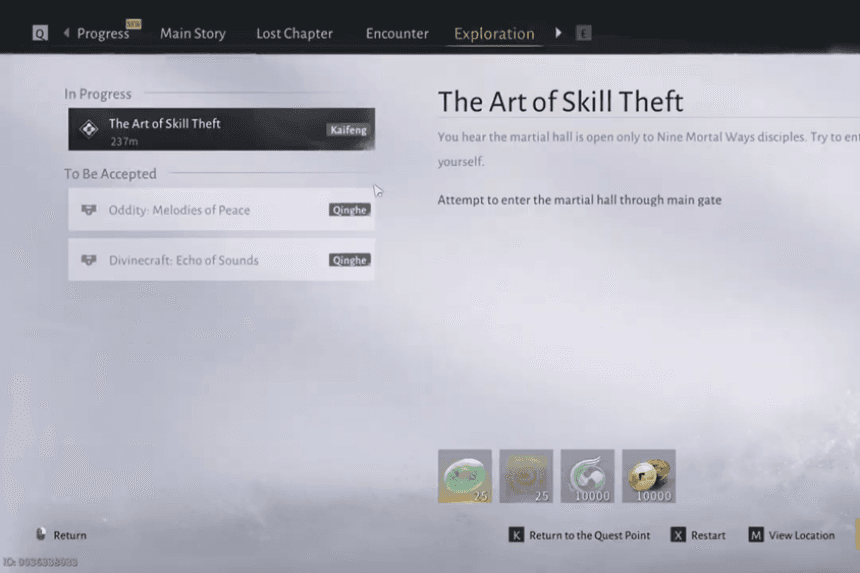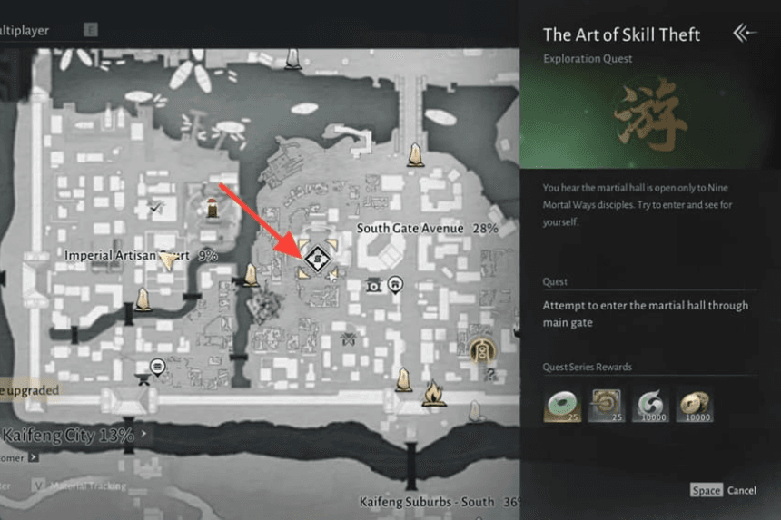 The Art of Skill Theft is an investigation quest that incorporates some tracking and light puzzle-solving, with a bit of stealth. You will follow clues throughout Kaifeng City, learn a bit about trickery, and by the end, you will unlock a useful Mystic Skill.