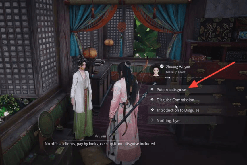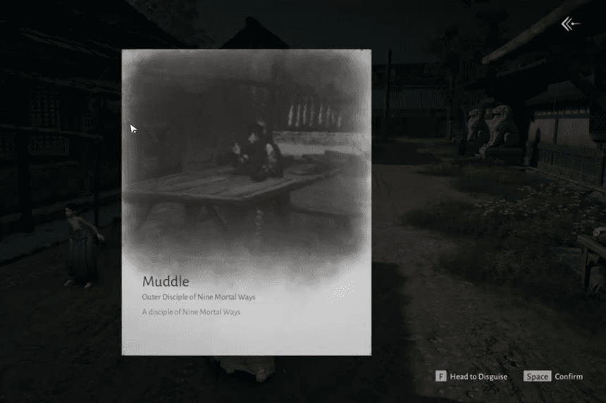 Find Muddle sitting on a bench near the Martial Hall. Observe him and create his portrait. This portrait is later used to create your disguise. Go to the Kaifeng Fairground Market and find Wuyan. Show her the portrait and ask for makeup that matches Muddle’s appearance. Once she’s done, you’ll be fully disguised. With the disguise on, head back to the Martial Hall. This time, the guards will let you through.