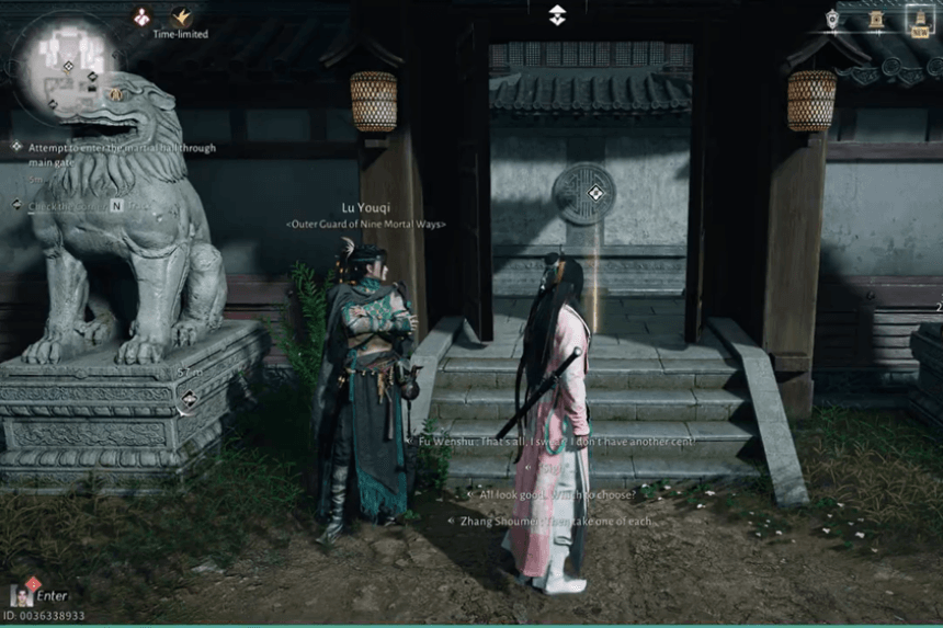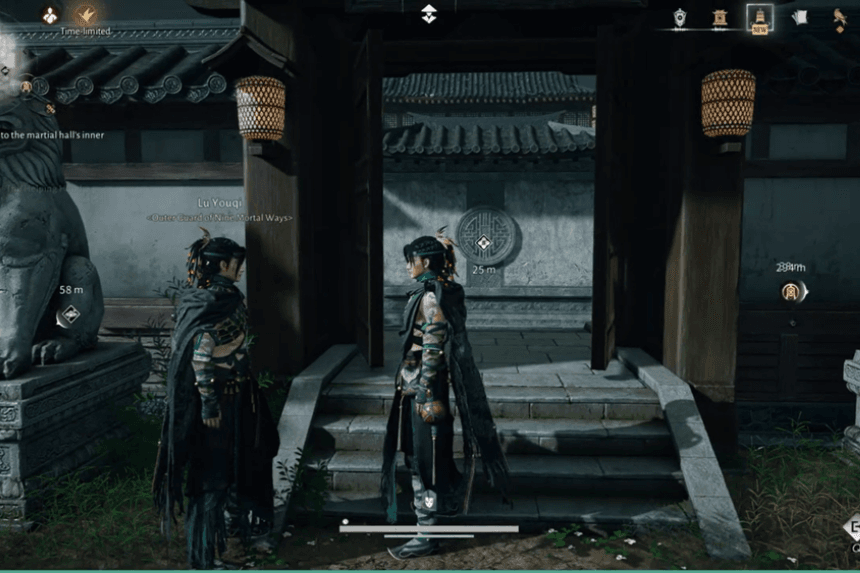 Follow the marker to the Martial Hall entrance. Trying to walk inside kicks off the quest. Lu Youqi is guarding the entrance and won’t just let you through. Talk to him to update the quest. Opposite the gate is a dishevelled old man. He speaks to you, and eventually he reveals that he is actually somebody else and gives you a hint about trickery involving disguise. This sets up the next step: creating a portrait.
