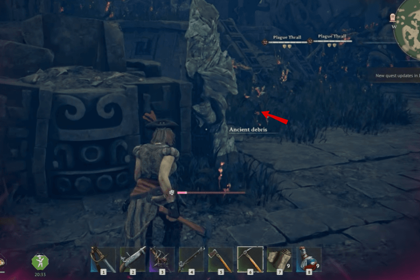 Look around the site, especially in corners, to find ancient debris nodes. You can mine these to obtain ancient scraps. Clearing out enemies first can make the process easier, as you may get attacked while mining.