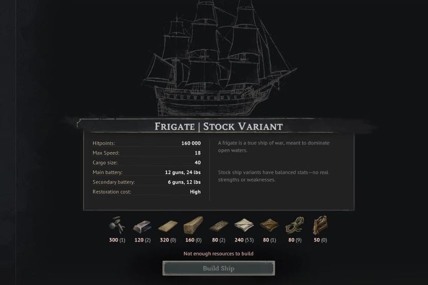 After fulfilling all the necessary conditions, you will be able to unlock the blueprint for the Frigate ship. But, you will still not be able to use the ship. For that, you have to go to your home base’s wharf, unlock it and make the ship. From there, you’ll see a list of materials required to craft it.