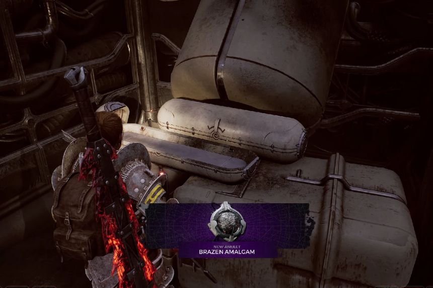 The Brazen Amalgam is located in the Logistics Bridge. In the train section that leads to the hole of no return, players must look at the railway below as they cross over on the other side of the second rail. There will be a catwalk that players need to jump down onto; the amulet is located there waiting to be collected.